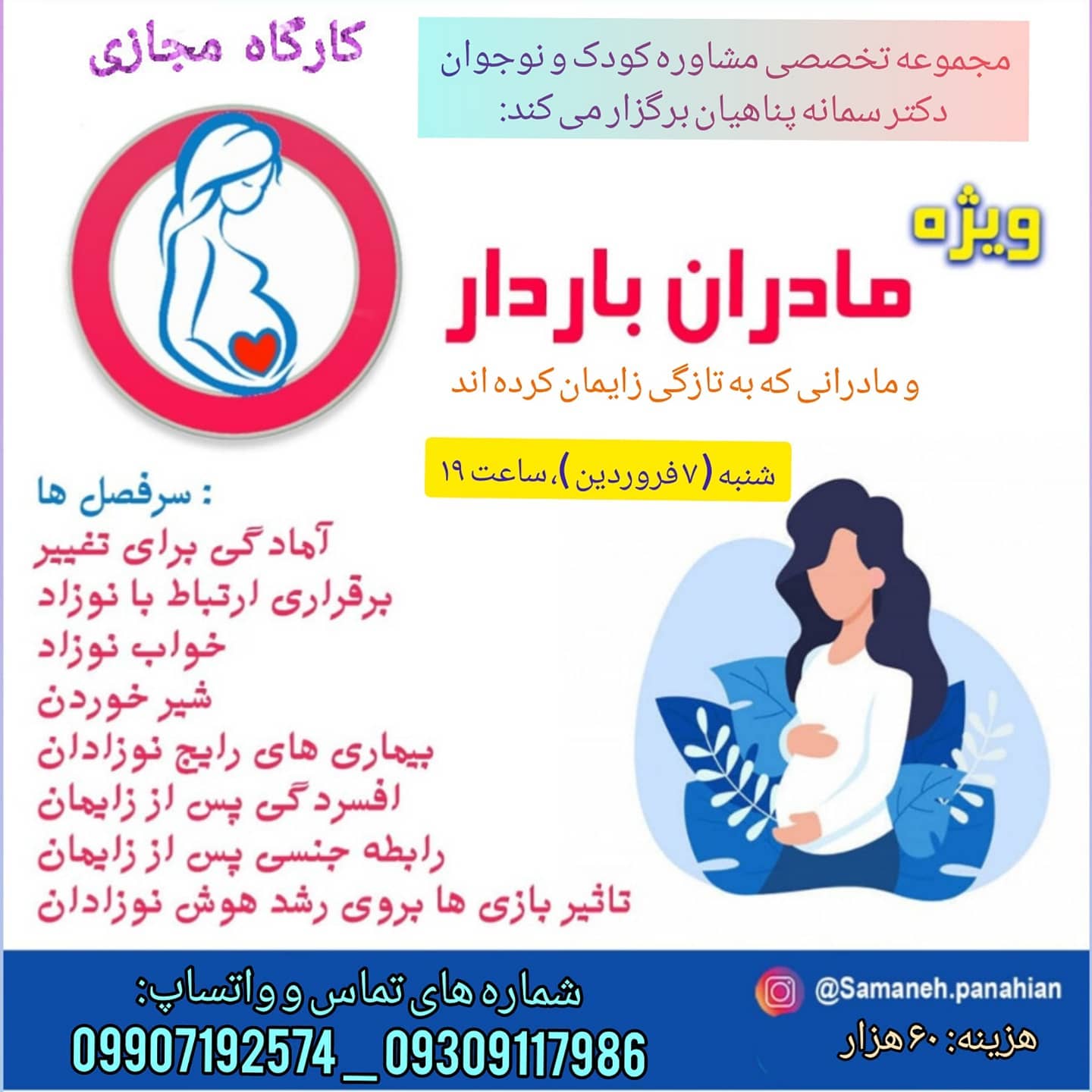 💕این کارگاه مجازی برای سه دسته از افراد مفیده👇 💚 خانم هایی که در آینده قصد باردار شدن دارن( حتی بارداری دوم ) 💚 خانم هایی که باردار هستن 💚 مادرانی که به تازگی زایمان کرده ان 💜 کارگاه های مجازی در برنامه واتساپ تشکیل میشه. 💜 نیازی نیست حتما در همان ساعت آنلاین باشید، مطالب برای همیشه باقی می مونه و هیچ وقت حذف نمیشه🛎 🔸️کاملا کاربردی و مفید 🔸️ ✴برای شرکت در کارگاه، به شماره 09309117986 در واتساپ پیام دهید @samaneh.panahian @samaneh.panahian 4-8-15-16-23-42