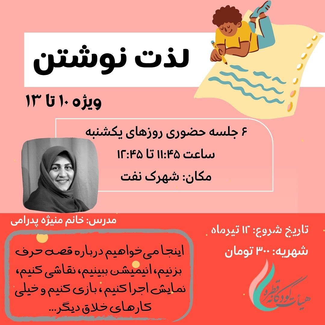 ✅ ثبت نام فقط از طریق پیامرسان ها با شماره: 09190161204 لذت نوشتن🖊 ویژه کودکان ۱۰ تا ۱۳ سال👩 مدرس: خانم منیژه پدرامی ✅ اینجا میخواهیم درباره قصه حرف بزنیم/ انیمیشن ببینیم/ نقاشی کنیم/ نمایش اجرا کنیم / بازی کنیم و خیلی کارهای خلاق دیگر... ⏰زمان:۱۱:۴۵ تا ۱۲:۴۵ 📆روز: یکشنبه 🔹تعداد جلسات: ۶ 💳شهریه: ۳۰۰ هزار تومان 📆تاریخ شروع: ۱۲ تیرماه 🔸مکان: شهرک نفت 🔹هدف از دوره: داستان همیشه برای همه گروههای سنی جذاب بوده و هست. وقتی به شکل خلاقانه همراه با بازی، نقاشی، نمایش، انیمیشن و ... ارائه شود، اثرگذارتر خواهد بود. در این کارگاه کودکان با عناصر داستان مثل شخصیت، ماجرا، اوج، گره، موضوع و... بطور غیرمستقیم آشنا میشوند. این کارگاه در بالا بردن اعتمادبهنفس، جسارت، خلاقیت، تفکر خلاق در کودک بسیار مؤثر خواهد بود. بدیهی است که در پرورش خلاقیت، درستنویسی، منطق و نظم ذهنی هنرجو نیز مفید خواهد بود. مباحث دوره: قصه و انیمیشن. تصویر و قصهپردازی. خیالپردازی و نقاشی. قصه و نمایش. مصاحبه و گزارشگری و ... 🔸🔹🔸🔹🔸🔹🔸 🔲 معرفی مدرس: منیژه پدرامی کارشناسی ارشد ادبیات کودک و نوجوان. نویسنده کودک و نوجوان. با 20 سال سابقه تدریس نویسندگی خلاق در انجمن نویسندگان، حسینیه ارشاد، نگارخانه اقدسیه و... نویسنده مجلاتی چون موفقیت، دنیای قلم، سروش نوجوان و...نویسنده آثاری چون مسافران کهکشان، دزد کتاب، تانک عاشق، انیمیشن دهکده بزابزا، پوریا کوچولو، خورشید کجاست. برگزیده در بخش داستان نوجوان جشنواره انسان تمام ۱۴۰۰ و... #کارگاه_نوشتن#ویژه_نوجوانان #نویسنده#نویسندگی#نوشتن#کلاس_نویسندگی#نویسنده_حرفه_ای