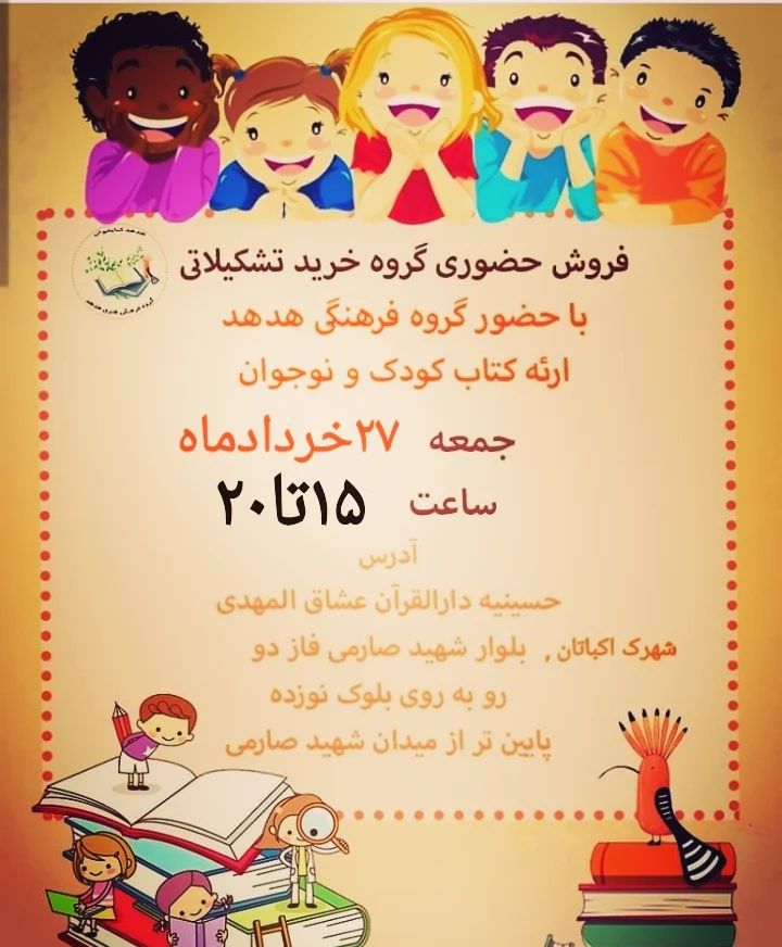 بالاخره بعد از مدتی غیبت طولانی روز جمعه به صورت حضوری میتونیم ببینیمتون. علاقمندان به کتابهای کودک میتونن از تخفیف ۵درصد روی کلیه کتابها استفاده کنند. تخفیف ویژمون برای خانواده های بالای سه فرزند هم همچنان محفوظه✌️😍🇮🇷 میتونید دوستانتون رو هم مطلع کنید ✌️ با این کار به ما انگیزه و نشاط میدید برای ادامه کار و مهمتراز همه اینکه خوشحال میشیم ببینیمتون.🌟 درضمن فروش حضوری مختص بانوان هست.