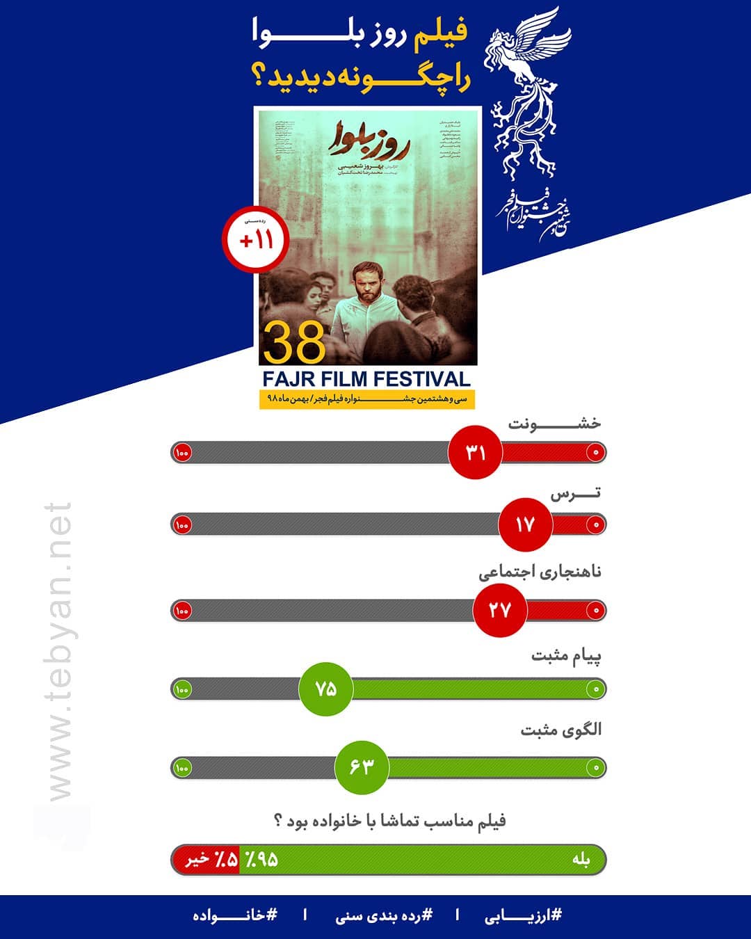 نظرسنجی کدومو از تماشاگران "روز بلوا " 📊خشونت : ۳۱ 📊ترس : ۱۷ 📊ناهنجاریهای اجتماعی : ۲۷ 📊پیام مثبت : ۷۵ 📊الگوی مثبت : ۶۳ ۹۵ درصد تماشاگران این فیلم را مناسب تماشا با خانواده دانسته اند. نظر شما درباره این فیلم چیست❓ #فیلم #جشنواره_فیلم_فجر #کدومو #روز_بلوا #خشونت #ترس