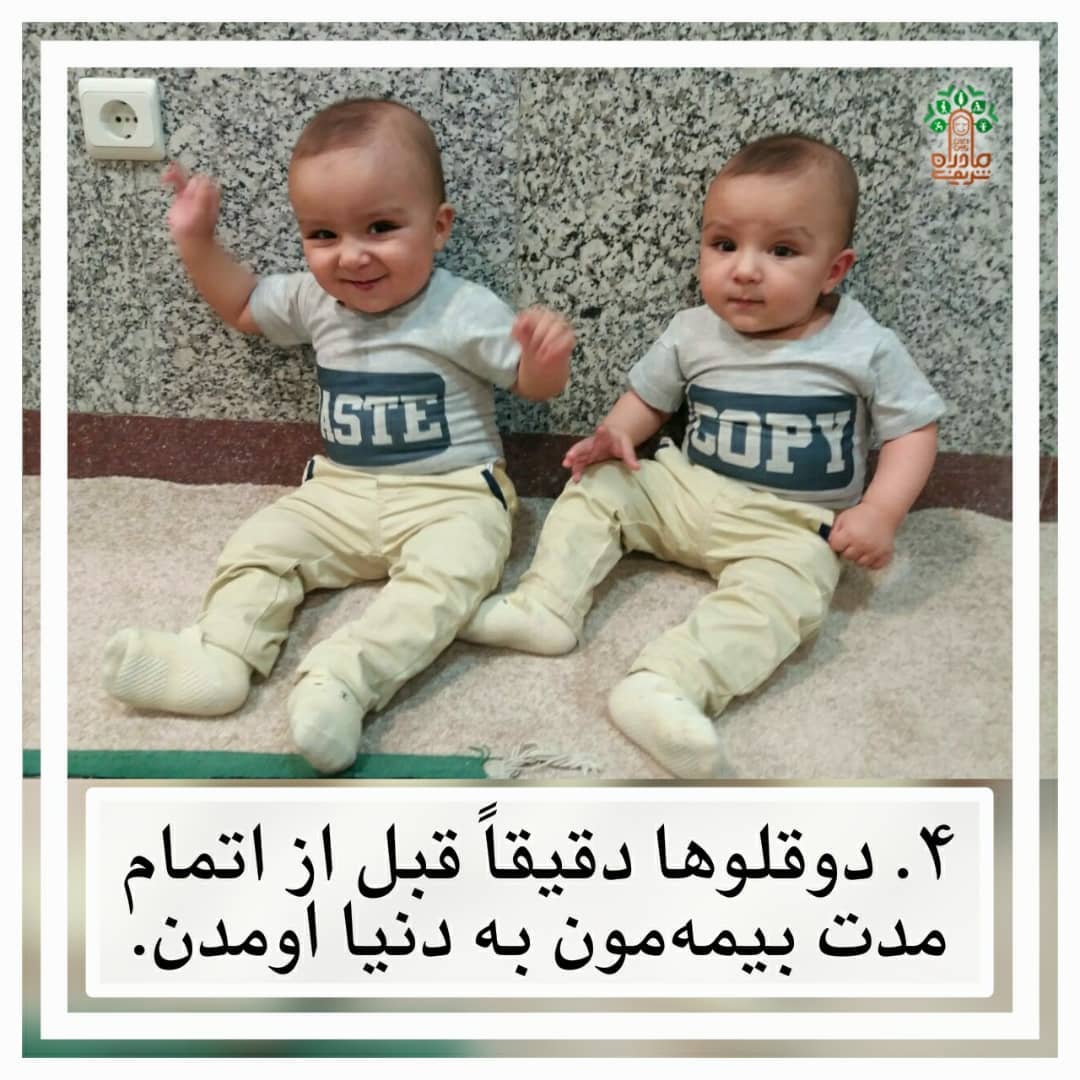 . #ح_کرباسی ( مامان #حسنا ۹ساله ، #محمدحسین و #محمدهادی ۵ساله و #زینب ۱ساله) #قسمت_چهارم دورهی کارشناسی گرافیکم رو تموم کردم و حسنا تقریبا ۳ سال و نیمه بود که دو قلوها رو باردار شدم. دوران بارداری خاص و سختی داشتم. به خاطر شرایط دوقلویی نمیتونستم خیلی از کارها رو انجام بدم یا حتی بیرون برم. آخرا هم دیگه استراحت مطلقِ مطلق بودم و چارهای نداشتم جز اینکه برم خونهی مامانم اینا. همسرم شبها میاومدن به من و دخترم سر میزدن و بعدش میرفتن خونهی خودمون. البته میتونستن همونجا بمونن شبها ولی خونهی خودمون راحتتر بودن. اون چند ماه برای هر دومون خیلی سخت و دیر گذشت. پسرها قرار بود هشتم مهرماه به دنیا بیان. ولی با نظر دکترم مجبور شدیم ۲۷ شهریور عمل سزارین رو انجام بدیم. جالب اینجا بود که دقیقا آخر شهریور بیمه تکمیلی مون تموم میشد و هزینهش بدون بیمه زیاد میشد. اما نهایتاً خدا خواست و زودتر به دنیا اومدن و تونستیم از بیمه استفاده کنیم.😇 اینم از الطاف ویژهی خدا بود که توی زندگیمون حسش کردیم. پسرها خداروشکر سالم بودن ولی یه مقدار کوچیکتر و ضعیفتر از بچههای معمولی. به همین خاطر باید هفت روز بیمارستان و توی دستگاه میموندن. روزهای اول خونهی مامانم بودم و بالاخره بعد از مدتها برگشتیم خونهی خودمون.😍 انگار تازه با سختیهای دوقلوداری مواجه شدم. رسیدگی به دوقلوها در طول روز که تنها بودم و همسرم سر کار بودن خیلی سخت بود.🤪 گاهی فقط میرسیدم ناهار حسنا رو بدم و خودم اینقدر مشغول دوقلوها بودم که حتی نمیتونستم ناهار بخورم!! همهش میگفتم خدایا کی میشه این دوران و سختیهاش تموم بشه.😥 همسرم هم البته وقتایی که خونه بودن خوب پدری میکردن.😉👌🏻 نسبت به زمانی که حسنا تازه به دنیا اومده بود، تجربه و همدلی شون خیلی بیشتر شده بود و خصوصا چون بچهها دوقلو بودن، میدونستن باید همکاری کنن.😆 گاهی توی روز که تنها بودم، باید دوتاشون رو با یه دست بغل میکردم و با دست دیگه شیر خشک درست میکردم. سختیهای اون مدت و بغل کردنهای زیاد کار دستم داد. پسرا هشت ماهه بودن که کمردرد شدیدی گرفتم. رفتم دکتر و گفت دیسک کمرت جابهجا شده. باید بیشتر استراحت کنی. یه هفته استراحت مطلق بودم و خداروشکر کارم به عمل نکشید. بعد از اون ماجرا همسرم گفتن: دیگه نمیشه اینطور ادامه داد! حتما باید یه پرستار پیدا کنیم بیاد کمکت وقتایی که من سرکارم.👌🏻 #تجربیات_تخصصی #مادران_شریف_ایران_زمین