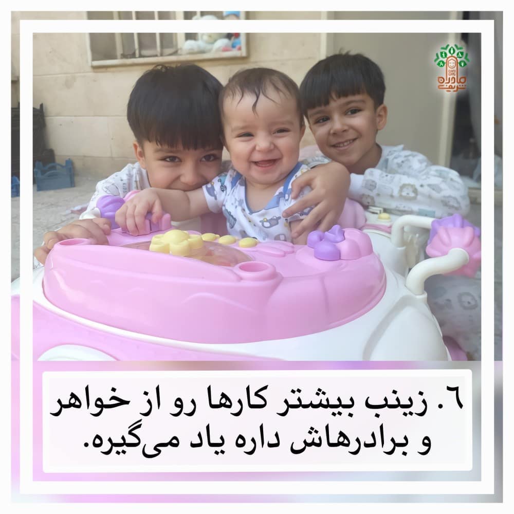 . #ح_کرباسی ( مامان #حسنا ۹ساله ، #محمدحسین و #محمدهادی ۵ساله و #زینب ۱ساله) #قسمت_ششم توی این یه سالی که زینب به دنیا اومده خواهر و برادرهاش معلمش بودن.😍 سینهخیز و چهار دست و پا و راه رفتن و بازی کردن و کلمات ساده رو ازشون یادگرفته.👌🏻 همین چند وقت پیش دیدم حتی موقع سنگ کاغذ قیچی هم کنارشون نشسته بود و اداشون رو در میآورد.😆 پسرها خیلی برای بزرگ شدن زینب ذوق دارن. توی هر مرحله از رشدش با کنجکاوی و علاقه کنارش میشینن و نگاهش میکنن. اولین قدمهایی که بر میداشت رو میشمردن و هر روز به من گزارش میدادن که مثلاً امروز دو قدم بیشتر از دیروز تونست راه بره.😃 گاهی که به اصرار خانوادهی همسرم حسنا و پسرا رو میفرستم خونهشون تا خودم یه مقدار به کارهام برسم. زینب بیشتر بهونه میگیره و در نبود خواهر و برادرهاش حوصلهش سر میره. وقتی حسنا کوچیک بود، براش خیلی کتاب میخوندم. در طول روز یه زمانی به طور ویژه باهاش بازی میکردم. خمیربازی و آبرنگ و...😍 بزرگتر که شد، بهش شعر و سورههای قرآن رو یاد میدادم. وقتی که دوقلوها به دنیا اومدن، سرم خیلی شلوغ شد و نمیرسیدم براشون همون قدری که برای حسنا وقت گذاشته بودم، وقت بذارم. اما به جاش از همون کوچیکی حسنا باهاشون بازی میکرد. گاهی حتی بغلشون میکرد و آرومشون میکرد. منم البته سعی میکردم ولو خیلی کم، حتماً زمانی رو برای بازی باهاشون اختصاص بدم. ولی میدیدم که بازیهایی که با خواهرشون انجام میدن رو خیلی بیشتر دوست دارن. دوقلوها که بزرگتر شدن و حسنا هم مدرسهای شد، دیگه رسماً نقش یه خانوم معلم مهربون رو براشون بازی میکرد و خودجوش به داداشهاش شعر و سورههای قرآن رو یاد میداد.😍 یا حتی گاهی حروف الفبا رو هم باهاشون کار میکرد.👌🏻 گاهیم خودش اجازه میگرفت و بساط آبرنگ و نقاشی رو پهن میکرد.😇 حسنا که بچه بود، ما براش کتاب میخوندیم و الان حسنا برای پسرا و خواهر کوچولوش کتاب میخونه. گاهی دوقلوها شبها میان خواهش میکنن که اجازه بدیم آبجی یه کتاب دیگه هم براشون بخونه.😁 گاهی هم باهم دعوا دارن. حسنا از اینکه پسرا اتاق و وسایلش رو به هم میریزن، عصبانی میشه و پسرا هم معمولاً سر اسباببازیها دعوا میکنن. منم بهشون گفتم که اگه نتونید مشکلتون رو حل کنید اون اسباببازی باید بره بالای کمد.🤨 خودشون این رو به عنوان یه قانون پذیرفتن و گاهی میان میگن مامان این اسباببازی رو بذار بالا چون دعوامون میشه.😆 #تجربیات_تخصصی #مادران_شریف_ایران_زمین