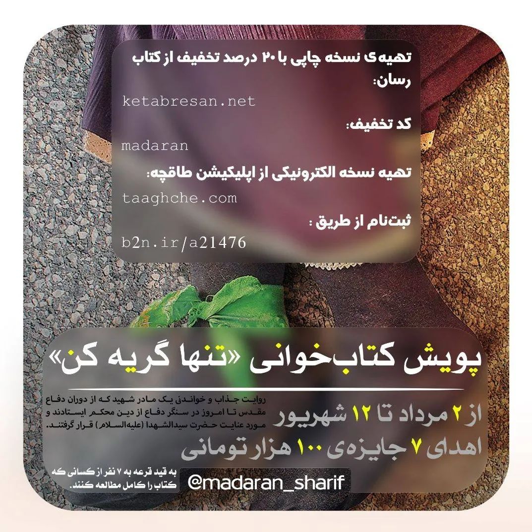 . مادران شریف ایران زمین برگزار میکند: 📚 پویش کتابخوانی «تنها گریه کن» روایت جذاب و خواندنی یک مادر شهید که از دوران دفاع مقدس تا امروز در سنگر دفاع از دین محکم ایستادند و مورد عنایت حضرت سیدالشهدا (ع) قرار گرفتند. 📌 از ۲ مرداد تا ۱۲ شهریور 🎁 اهدای ۷ جایزهی ۱۰۰ هزار تومانی به قید قرعه به ۷ نفر از کسانی که کتاب را کامل مطالعه کنند. 🔸 تهیه نسخه چاپی با ۲۰ درصد تخفیف از کتابرسان: ketabresan.net/w/adDBz کد تخفیف : madaran 🔸تهیه نسخه الکترونیکی از اپلیکیشن طاقچه: taaghche.com/book/96144 ✅ ثبتنام از طریق : b2n.ir/a21476 برای اطلاعات بیشتر و ثبتنام و تهیه کتاب به هایلایت پویش تنها گریه کن مراجعه کنید. #پویش_کتاب_خوانی #تنها_گریه_کن #جایزه #مادران_شریف_ایران_زمین