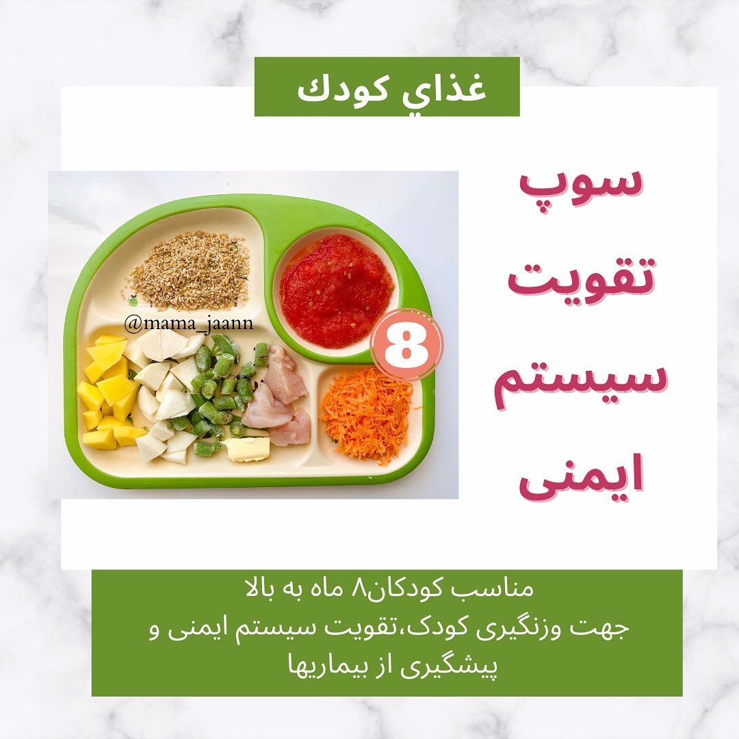 سلام ظهرتون بخیر✋🏻☀️🌤 امروز دستور ی سوپ عالی وخوشمزه آوردم که مناسبه واسه تقویت سیستم ایمنی و پیشگیری از سرماخوردگی😍😍 سوپ مرغ و شلغم(+۸) شلغم:۱عددکوچک سیب زمینی:۱عدد کوچک🥔 پوره گوجه فرنگی:۲قاشق غذاخوری🍅 لوبیا سیز خردشده:۱قاشق غذاخوری هویج:نصف عدد🥕 مرغ:۲۰گرم🍗 گندم:۲قاشق غذاخوری کره:۲۰گرم🧈 سویق خانگی:۱قاشق غذاخوری(آموزشش توپیج هست) ✅همه مواد رو به جز گندم با یک ونیم لیوان آب بزارید تا خوب بپزه👌🏻بعد از پخت گندم رو بهش اضافه کنید و بزارید تا بپزه و جا بیفته،۵دقیقه آخر سویق رو اضافه کنید.سوپ شما آماده ست 🥰😍نوش جان😎 1️⃣میتونید از عصاره قلم استفاده کنید.💪🏻 2️⃣آخر پخت میتونیدکمی جعفری ☘️خردشده بهش اضافه کنید. 3️⃣با چند قطره لیموترش خیلی خوب میشه.👌🏻 4️⃣میتونید بجای گندم از جو استفاده کنید. ✅اگر از اکسپلور پیج ما رو می بینی ی سر به پیج مون بزن😍😍🥰 @mama_jaann @mama_jaann @mama_jaann #تغذيه_سالم #تغذيه_كودك #غذاي_كودك #سرماخوردگی_کودکان #وزنگیری_کودک #رشد_كودك #غذاي_كمكي