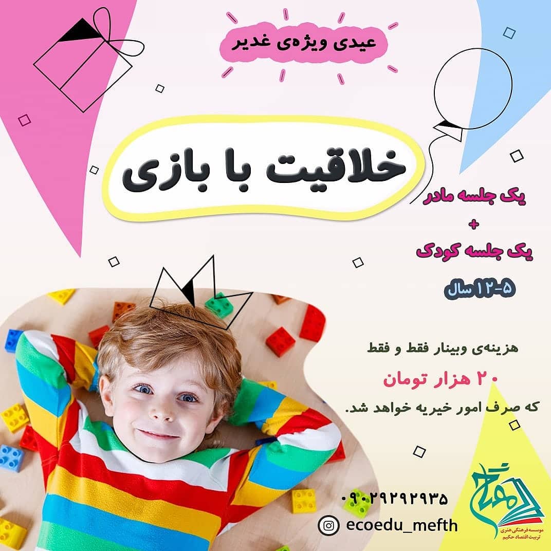 🔥توجه، توجه🔥 . 💥عیدی داریم چه عیدی💥 . << وبینار مادر و کودک خلاقیت با بازی>> 🤔حالا چرا خلاقیت❓🤔 👇👇👇 خلاقیت یکی از موضوعات مهم در تربیت اقتصادی و کارآفرینی کودکان و نوجوانان است. 👈اهمیت دادن به موضوع خلاقیت از دوران کودکی باعث رشد همه جانبه ی ذهن کودک میشه و به او کمک میکنه تا در برابر مشکلات و مسائل دچار اضطراب و تشویش نشه و با تسلط بر توانایی هاش راه حل مناسب و جدیدی را پیدا کنه. ✴از طرفی لازمه والدین هم در مسیر تربیتی بچه ها بر این موضوع و انواع آن تسلط داشته باشن تا بتوانند زمینه را برای رشد همه جانبه ی ذهن بچه ها فرآهم کنند. 🌸در کلاس والدین قراره با انواع خلاقیت ها آشنا شده و بازی و راهکارهای لازم برای تقویت هر بعد از خلاقیت معرفی بشه. . 🌸محتوای کلاس بچه ها چیه؟ در این کلاس قراره در قالب بازی های فردی و گروهی جذاب بعدهای مختلف خلاقیت کودکان تقویت بشه و خاطره ی شیرینی از عید بزرگ غدیر در ذهنشون بمونه. 💥 نکته : -ظرفیت هر کلاس کودک 5-7نفره که بر اساس سن تقسیم میشن. . ✴بچه های 5-12سال میتونن مهمون این جشن باشن. ✴ -کلاس در بستر واتساپ و یا اسکایپ خواهد بود. . 💥💥-نکته ی مهم دیگه اینکه: هزینه ی ثبت نام هر کلاس مادر یا کودک به تنهایی فقط و فقط 10هزار تومانه که همش صرف امور خیریه میشه. 👈زمان کلاس والدین: یکشنبه11مرداد ماه ساعت7-8بعدازظهر . 👈زمان کلاس کودک: دوشنبه ساعت 5-6 بعدازظهر (روز و ساعت کلاس ها بر مبنای تعداد کلاس ها و درخواستتون قابل تغییر است. ) . 👌مدرسین:سرکار خانم مریم حسینی بالام، سرکار خانم مائده جلوخانیان. . 👈👈ثبت نام فقط از طریق سایت(لینک در بیو) . meftahpub.ir . 💠موسسه فرهنگی هنری تربیت اقتصاد حکیم(مفتاح) . #خلاقیت#تربیت_اقتصادی_کودکان#هوش_مالی_کودکان#وبینار_رایگان#عیدی_غدیر#جشن_بزرگ_ولایت#عید_غدیر#عیدتون_مبارک#وبینار_مادر_کودک_خلاقیت#خلاقیت_با_بازی#کارآفرینی_کودک#موسسه_فرهنگی_هنری_تربیت_اقتصادی_مفتاح