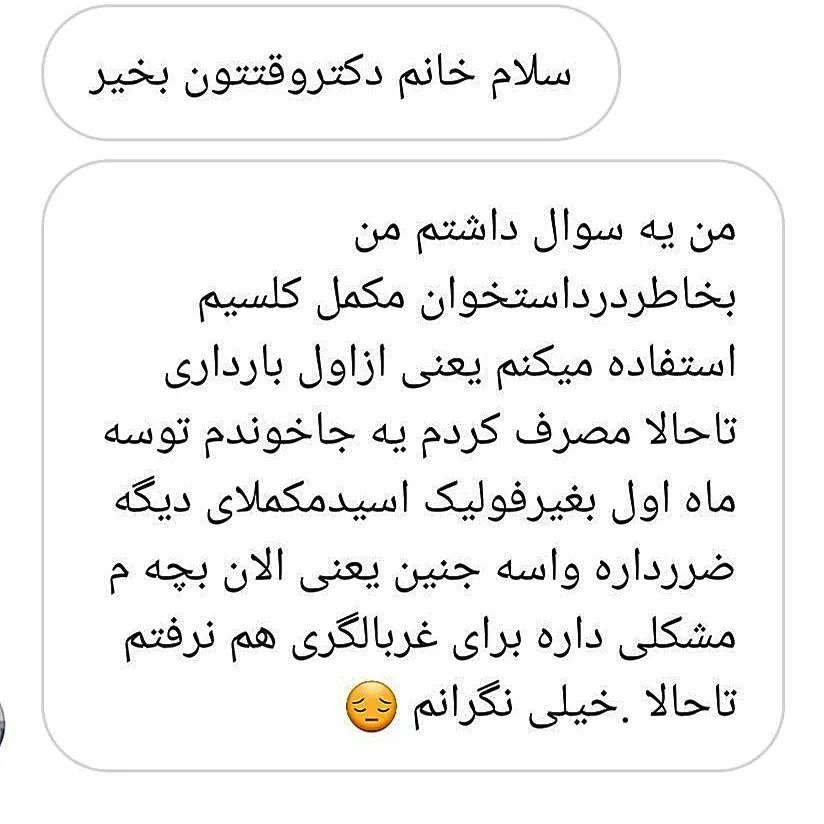 سلام دوستان 🔹️یسری از خانمها سوال میکنن در سه ماهه اول میتونیم قرص آهن یا کلسیم بخوریم باید بگم نه ⛔ 🔷️در سه ماه اول تنها قرص مجار اسید فولیک و ویتامین دی هستش و بعد از هفته شانزدهم مکمل آهن و کلسیم شروع میشه . 🔹️مصرف قرص اسید فولیک از سه ماه قبل بارداری تا هفته بیستم ادامه پیدا میکنه . . مشاوره زنان /بارداری/زایمان تعیین جنسیت جنین درمان قطعی و کامل واژینیسموس ویزیت حضوری/تلفنی /آنلاین . @moshaver.mama . . . #مکمل_بارداری #قرص_مکمل #اسید_فولیک #کلسیم #قرص_آهن #مکمل_آهن #قرص