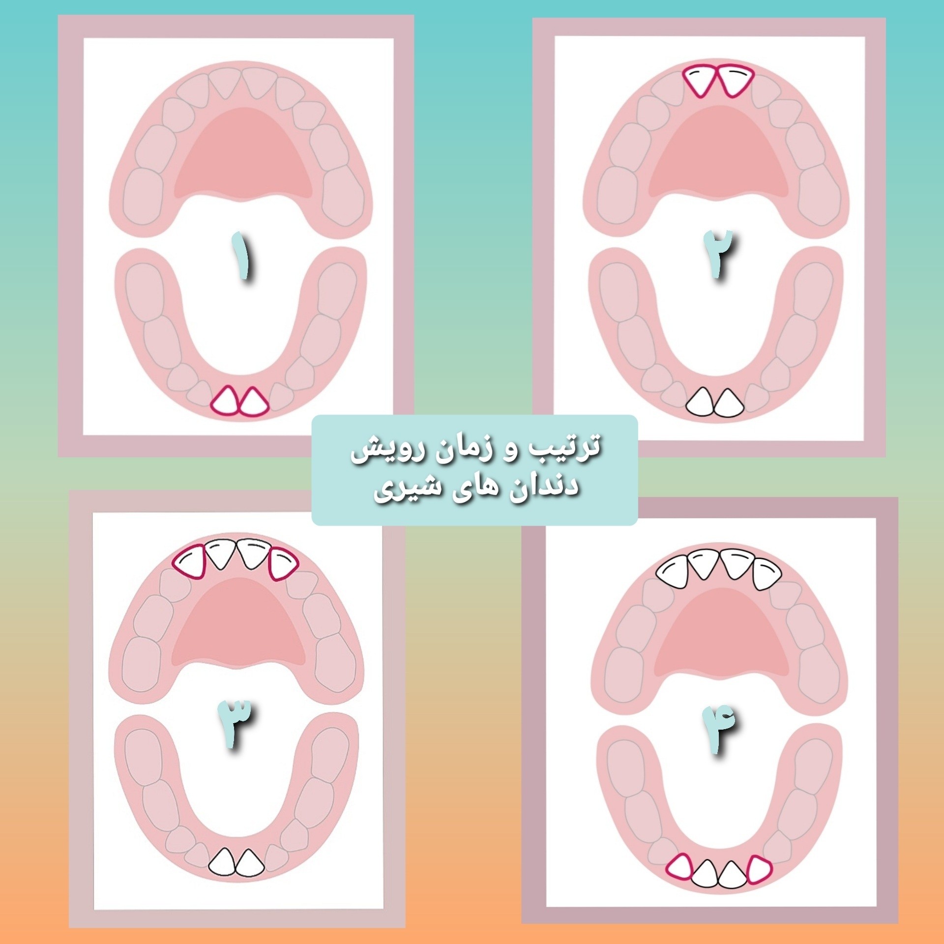 ⏳زمان و ترتیب رویش دندان های شیری (قسمت اول): به طور معمول زمان رویش دندان های شیری از ۶ ماهگی تا حدود ۳ سالگی ست. اما این زمان در همه کودکان یکسان نیست. گرچه اغلب کودکان در بازه نرمال قرار دارند اما در تعداد کمی، سن رویش اولین دندان، قبل از ۶ ماهگی ست و در عده ای تا یک سالگی هنوز دندانی رویش نیافته است. ⚠️نکته مهم: اگر تا ۱۳ ماهگی، هیچ دندانی رویش نیابد، حتما برای بررسی بیشتر باید به متخصص دندانپزشکی اطفال مراجعه شود. 1️⃣ دندان های پیشین فک پایین: 🍭حدود ۶ تا ۱۰ ماهگی 2️⃣ دندان های پیشین فک بالا: 🎈 حدود ۸ تا ۱۳ ماهگی 3️⃣ دندان های پیشین کناری فک بالا: 🍭حدود ۹ تا ۱۳ ماهگی 4️⃣ دندان های پیشین کناری فک پایین: 🎈 حدود ۱۰ تا ۱۶ ماهگی #دندان #دندانپزشکی_کودکان