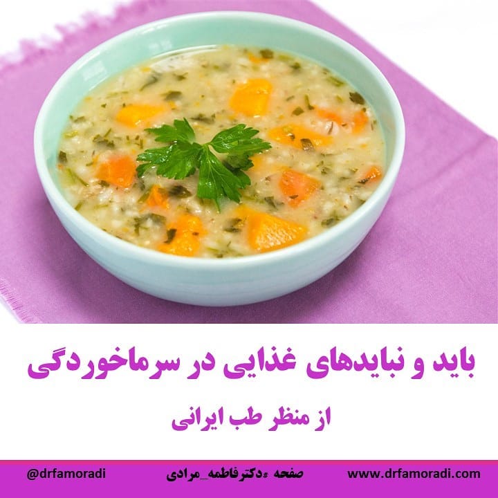 @drfamoradi باید و نبایدهای غذایی در سرماخوردگی از منظر #طب_ایرانی . 1. با اولین علایم سرماخوردگی، پرخوری را کنار بگذارید! . 2. تا درمان کامل #سرماخوردگی از مصرف غذاهای سنگین، چرب، تند و ترش، ماست، بستنی و خوراکی های خیلی سرد خودداری کنید. . 3. در صورت داشتن تب، از مصرف چند دسته خوراکی پرهیز کنید: شیر، گوشت قرمز و میوه های آبداری مثل هندوانه و خربزه. . 4. بهترین غذا در چند روز ابتدای آبریزش رقیق، سوپ جو است. هر زمان که احساس گرسنگی یا ضعف کردید یک پیاله از این سوپ را بخورید. شاید این زمان برای شما، هر یکی دو ساعت باشد. . #سوپ_سرماخوردگی را با کمی گوشت مرغ تازه، جو پرک، هویج، سبزی تازه جعفری و گشنیز تهیه و با لیمو ترش تازه میل کنید. افزودن شلغم نیز به این سوپ مفید است. در این سوپ، رشته، قارچ، ذرت، شیر یا خامه نریزید. . . #دکتر_فاطمه_مرادی پزشک و #متخصص_طب_ایرانی #سرماخوردگی_مرادی . @drfamoradi