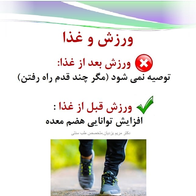 در ادامه روشهای صحیح غذا خوردن: 🔷🔷9. ورزش و غذا: 🔺ورزش قبل غدا: در طب سنتی بسیار توصیه می شود و به بهبود هضم معده و دفع مواد زاید از بدن کمک می کند. در واقع بدن آماده قبول غذای جدید می شود 🔺 ورزش بعد از غذا: توصیه نمی شود. اما در بیمارانی مشکل هضم دارن توصیه می شود 30 قدم پس از غذا راه بروند. سالم و تندرست باشید 🌹 #طب_سنتی #طب_ایرانی #انجمن_علمی_طب سنتی #زندگی_ سالم #غذای _سالم #هضم _غذا #خوردن #ورزش #آرامش #سلامتی #تندرستی #سبک_زندگی #زندگی_بهتر #چاقی #اضافه وزن #مزاج #طبع #مزاج #ورزش