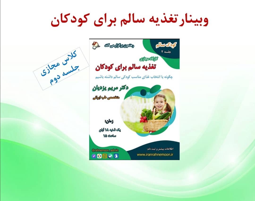 🌸کلاس آنلاین تغذیه کودکان در طب ایرانی🌸 🔹غذاهای مقوی برای کودکان کدامند؟ 🔹چگونه با انتخاب غذای مناسب کودکی سالم داشته باشیم؟ 🔹کدام گوشتها، لبنیات، سبزیجات، میوه جات، مغزیجات و ادویه جات برای کودک من مناسب است؟ 🔹معرفی تنقلات سالم و مقوی خانگی برای کودکان 🔹معرفی اغذیه مناسب در تقویت مغز و قلب و گوارش کودکان 🔴 رهنمون برگزار می کند: کارگاه آموزشی مجازی « تغذیه سالم » ✅ دکتر مریم یزدیان متخصص طب ایرانی ⏰ زمان : یکشنبه ۱۸ آبان، ساعت ۱۵ 💳 هزینه ثبت نام آزاد: ۳۰ هزار تومان 🎁 تخفیف نیمه بها برای مادران عزیزی که ۴ فرزند و بیشتر دارند 👨🏻💻 اطلاعات بیشتر و ثبت نام در سایت؛ www.iranrahnemoon.ir در پیام رسان بله: @rahnemoon_admin @iranrahnemoon #زندگی_سالم #سلامتی #خوردنی #مزاج #غذای_سالم #طب_سنتی #طب_ایرانی #سلامتی #تندرستی #طب_ایرانی #وبینار_آنلاین #وبینار_طب_سنتی #کودکان