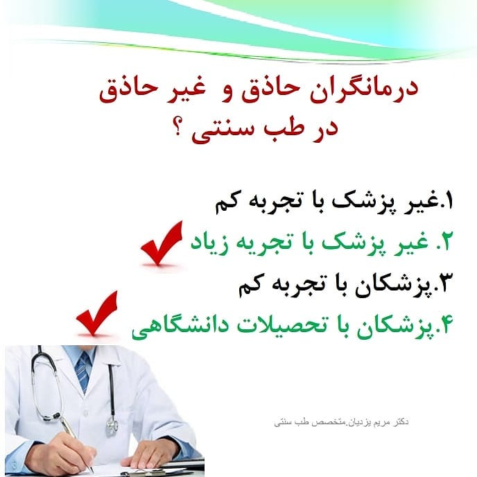 . 🌷شناسایی درمانگران حاذق طب سنتی🌷 امروزه شاهد حضور انواع درمانگران طب سنتی در سطح جامعه هستیم... .اما کدامیک از درمانگران صلاحیت لازم را دارند و آسیب کمتری را در درمان وارد میکنند؟؟؟ . لازم است که انواع درمانگران را در این رشته شناسایی کنیم تا دچار آسیب نشویم... ۱.دسته اول افرادی هستند که با خواندن چند کتاب خانگی و یا گوش دادن به چند برنامه تلویزیونی شروع به شناخت مزاج خود و اطرافیان کرده و براساس تجویزات کتابهای دم دستی؛ دست به درمان میزنند. این گروه طب سنتی رو رشته ای ساده تصور می کنند و نمیدانند که جدای از آنکه شناخت مزاج مردم امروز با توجه به تغییر سبک زندگی آنها نسبت به قدیم؛ کاری بسیار پیچیده است که حتی گاه اساتید خبره در آن درمانده اند؛ در کنار این مساله،تجویز گیاهان دارویی دارای عوارض بسیار و تداخلات فراوان میتواند باشند . مراجعه به این دسته را هرگز توصیه نمیکنیم.❌ ۲.دسته دوم اساتید بنام این رشته هستند که گاه بیش از سی یا چهل سال در این رشته بصورت تجربی فعالیت دارند. این گروه با تکیه بر دانش تجربی خود؛نقش موثری در درمان بیماران ایفا میکنند. مراجعه به این اساتید در کنار پزشکی امروز؛ می تواند تا حدودی زیادی برای بیمار راهگشا باشد.✔ ۳.دسته سوم پزشکانی هستند که پس از گذراندن دوره کوتاه طب سنتی (چه بسا چند روزه) ، خود را به عنوان متخصص این رشته به مردم معرفی می کنند. این دسته از همکاران که تعداد آنها در جامعه روز به روز بالاتر می رود،متاسفانه با تجویزات اشتباه خود بیماران را در معرض آسیب زیادی قرار می دهند. بعضا تجویزات افراطی و غیر علمی حجامت و فصد و زالودرمانی و یا تجویز ترکیبات گیاهی ای که از تداخلات دارویی آنها باهم و با داروهای شیمیایی بی اطلاع هستند؛ در بین این گروه دیده می شود. مراجعه به این دسته پزشکان را توصیه نمیکنیم.❌ ۴.دسته چهارم پزشکانی هستند که پس از پایان دوره پزشکی عمومی؛ در امتحان دکترای تخصصی این رشته شرکت کرده و پس از ورود به آن؛ با گذراندان دوره حدود ۴ تا ۶ ساله، با عنوان PHD از این رشته فارغ التحصیل می شوند. مراجعه به این دسته درمانگران را کاملا توصیه میکنیم؛چرا که دانش پزشکی را در کنار علوم طب سنتی آموخته اند و با تکیه بر دو دانش خطر کمتری را متوجه مردم می کنند.✔ طب_سنتی #طب_ایرانی #درمانگران #طب_سنتی #طب_ایرانی #انجمن_علمی_طب سنتی #زندگی_ سالم #غذای _سالم #سلامتی #تندرستی #سبک_زندگی #زندگی_بهتر #مزاج #طبع