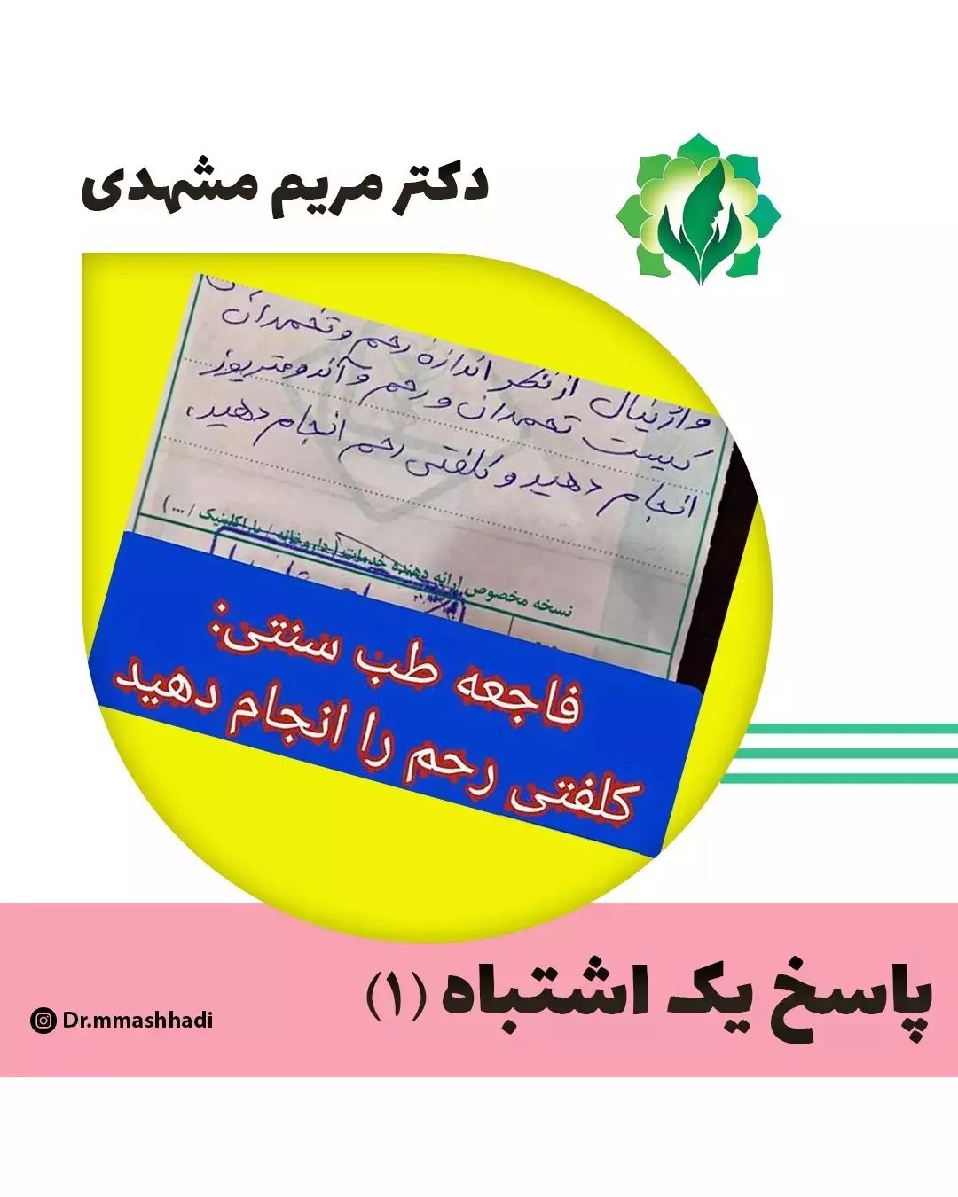 . 🔰 برخی دوستان و همکاران اطلاع دادند که اظهار نظر غیرمسئولانه ای درباره تخصص دانشگاهی طب سنتی و نیز درباره شخص بنده در برخی شبکه های اجتماعی منتشر شده است. . گرچه اشکالات آن روشن است ولی دوستانم اصرار داشتند برای مخاطبان عزیز، توضیحی تقدیم کنم. . فردی که دچار سوء تفاهم نسبت به طب سنتی دانشگاهی هستند، تصویری از یک نسخه در فضای مجازی دیده که نویسنده نسخه، به جای استفاده از مثلاً «سنجش ضخامت دیواره»، از واژه «کلفتی» استفاده کرده است. ایشان با انتشار این تصویر در صفحه خود، نام من را در کپشن این پست نوشته است.کامنت ها هم بسته بوده و امکان نقد فراهم نبوده است. . گرچه بعداً پست را اندکی ویرایش کرده اند کپشن آن پست، موجب شده تصور شود ایشان صاحب نسخه را کشف کرده اند و به همین علت، تصویر این پست با کپشن آن، در فضای مجازی دست به دست شده است. . 💢 چند نکته درباره این ماجرا تقدیم می کنم: . 1️⃣ الف) خط این نسخه، خط بنده نیست (خط مرا در تصویر این پست ببینید) ب) بخشی از مٌهر نظام پزشکی هم که در تصویر مشخص است، با نام و مُهر من تطابقی ندارد. نتیجه: این نسخه ارتباطی به بنده ندارد. (گنه کرد در بلخ آهنگری / به شوشتر زدند گردن مسگری) . 2️⃣ آیا اینکه ایشان در کپشن پست یادشده خود، اشتباهاً به جای استفاده از واژه «قالب»، از واژه «غالب» استفاده کرده، می تواند دلیل بر زیر سوال بردن رشته دانشگاهی ایشان باشد؟ حتما خیر. پس چرا چنین استدلال کردند؟ . 3️⃣ اگر نقدی دارند، لازم است ارائه شواهد بالینی مستند، گفتگو و بررسی تخصصی انجام شود. ادعا کافی نیست و شواهد باید قابل استناد باشد. ضمن اینکه در نقد طب سنتی، اطلاع نسبی از هر دو سنت طبی، ضرورت دارد. . . ⭐ با توجه به اشاره ایشان به «غربالگری» و اینکه با این موضوع هم نقدم کردند، درباره «غربالگری»، توضیحاتی را تقدیم می کنم. . #طب_سنتی #دکتر_مریم_مشهدی #غربالگری