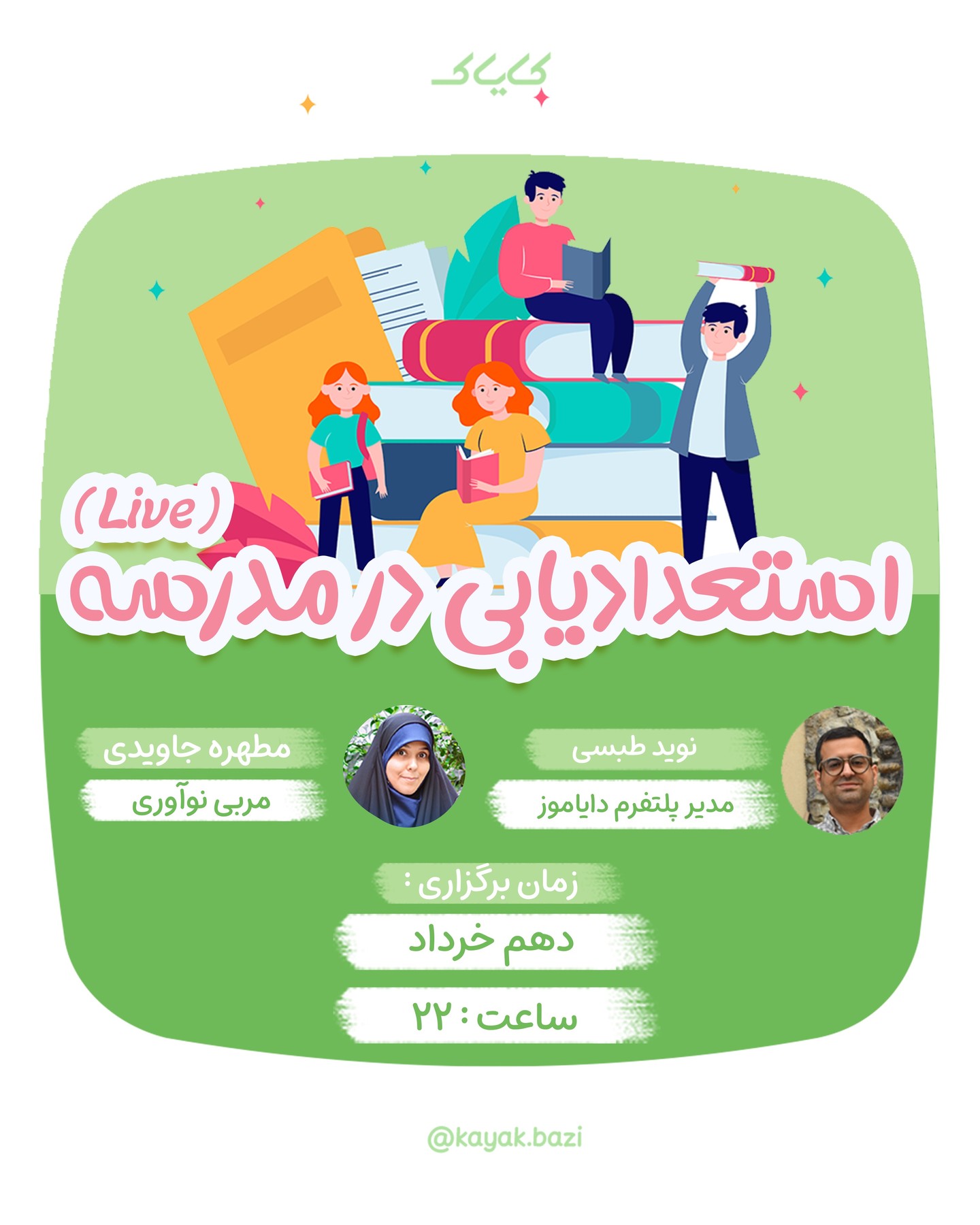 #استعداد_یابی در مدارس استعدادیابی دانش اموزان در مدارس به چه صورت هست ؟ معلمین چگونه میتوانند استعداد دانش آموزان را کشف کنند؟ با توجه به تم های استعدادی متفاوت نحوه تدریس و ارزشیابی باید چگونه باشد ؟ به میزبانی : مطهره جاویدی (مربی نوآوری ) با حضور: آقای نوید طبسی (مدیر پلتفرم دایاموز) @dayamooz.co تاریخ برگزاری : دهم خرداد ساعت 22 #استعدادیابی #استعدادسنجی