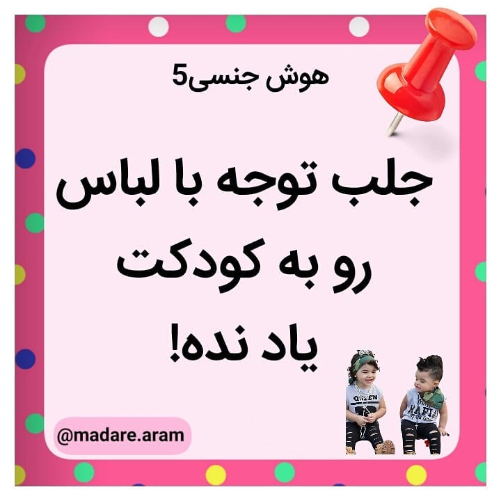 به نام خدا سلام🌹🌹🌹 🌺 همیشه بحث تعادل رو باید تو ذهنمون مرور کنیم. 🌺 نه اینکه بچه رو با لباس نامرتب بگردونیم نه اینکه اینقدر روی خط اتو و تمیزیش حساس بشیم که بچه جرئت نکنه راحت بازی کنه و اگر لباسش یکم کثیف بشه توبیخش کنیم! 🌺نه اینکه دختر بچه ی کوچولو رو زیر مقنعه و چادری که خدا هم راضی نیست از این سن بپوشونیم و نه اینکه لباس نیم تنه تن دخترمون کنیم. 🌺 نه اینکه موهای پسرمون رو بلند کنیم و تافت بزنیم و این کارا نه اینکه کچلش کنیم و خجالت بکشه یا اینقدر نامرتب باشه که ازین ور باعث جلب توجه بشه.... 🌺خلاصه پست های توجه رو از هوش معنوی هم مطالعه کنید. #استاد_سلطانی #هوش_متعادل #رویکرد_هوش_متعادل #کودک_متعادل #تربیت_جنسی #تربیت_صحیح_کودک #تربیت_کودک #معرفت_مادری #والدگری_آگاهانه #کودک #روانشناسی #روانشناسی_کودک #روانشناسی_رشد #فرزندپروری #آرایش_کودک #هوش_جنسی #آرایش_کودکان_ممنوع