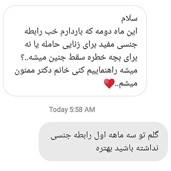 یکی از سوالات پر تکرار دایرکت من 👇 . 🎈رابطه جنسی در بارداری . 🔴در سه ماهه اول بخاطر خطر سقط جنین به خانمهای باردار توصیه میشه رابطه جنسی نداشته باشن یا خیلی محدود باشه ❌ . ◀️و بعد از ماه چهارم بسته به موقعیت جفت داره اگر جفت روی دهانه رحم و یا نزدیک اون نباشه مشکلی برای شروع رابطه جنسی نیست ✅ ولی اگر جفت بصورت مارژینال یا پرویا (جفت روی دهانه رحم یا نزدیک به اون باشه )رابطه جنسی کاملا محدود میشه❌ تا شرایط مادر نرمال بشه و جفت به سمت بالا بره . . 🎈اگر سوالی در این رابطه دارید کامنت بزارید 👇. . . مشاوره زنان/بارداری تعیین جنسیت جنین 👶 ویزیت حضوری/تلفنی/آنلاین 🌹 @moshaver.mama @moshaver.mama . . . #رابطه_زناشویی #رابطه_جنسی_در_بارداری #سقط_جنین