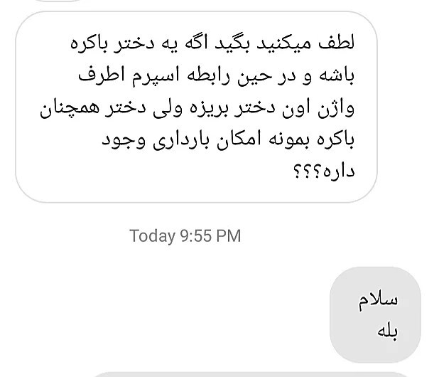🔶️شاید یکی از بیشترین سوالاتی که تو دایرکت دارم در همین مورد هستش۰ 👇👇 این پست و مخصوص دختران جوان گذاشتم حتما کپشن و بخونید. ◀️خیلی از زوجین تو دوران نامزدی رابطه جنسی کامل(دخول) ندارن و نمیخوان که پرده بکارت خانم آسیب ببینه . رابطه و تماس سطحی دارند . نکته مهم 📛. در صورتیکه دخول انجام نشه ولی اسپرم روی ناحیه تناسلی خانم قرار بگیره هم احتمال بارداری هستش😮 . . 🔴بخاطر اینکه واژینال خانم حالت کشش اسپرم و بسمت بالا ایجاد میکنه و بدلیل متحرک بودن اسپرم احتمال انتقال آن به رحم فراهم میشه 😓. . ◀️پس در دوران نامزدی زوجین دقت کنن که حتما برای روش پیشگیری از کاندوم استفاده کنن و یا اگر اسپرم بطور ناگهانی روی واژینال خانم قرار گرفت سریعا شستشو بدن و لباس زیر و عوض کنن . . . اگر سوالی در این زمینه دارید کامنت بزارید حتما جواب میدم . . . .. مشاوره آنلاین/حضوری/تلفنی @moshaver.mama . . #رابطه_زناشویی #رابطه_کنترل_نشده #رابطه_جنسی_قبل_از_ازدواج #کاندوم_زنانه #کاندوم