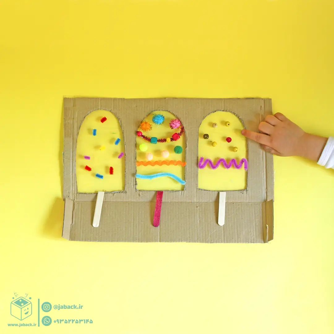 🍭🍬🍨🍦 با یه تیکه مقوای کارتن و مقداری چسب پهن میتونید بستنی درست کنید و از بچه ها بخواین بستنی ها رو با سلیقه خودشون تزیین کنن. شمام بستنی درست کنین و عکسشو برامون بفرستین 😍🤩